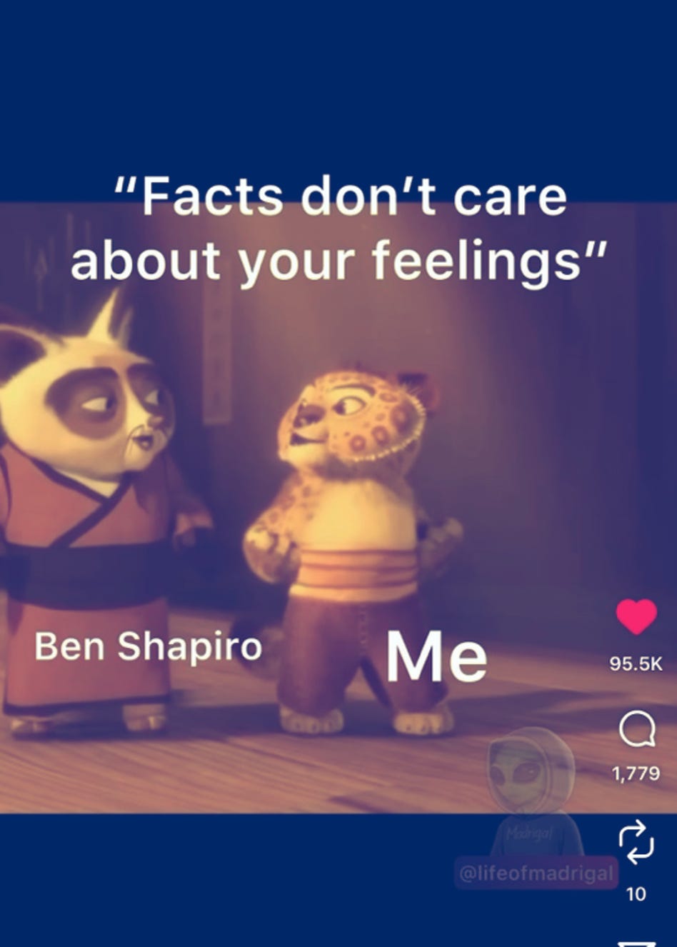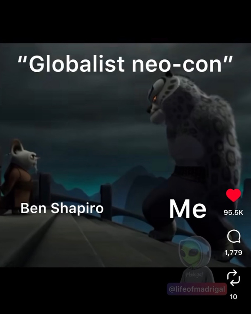 Chronically scrolling through Instagram—a weakness of mine—my right-coded algorithm brought me this Kung Fu Panda universe reel: The headline is “Facts don’t care about your feelings,” showing Ben Shapiro as Master Shifu, “me” as a young Tai Lung being trained by him. Then we fast forward to “me,” grown up, strong, muscular Tai Lung confronting my old master—tiny, elderly “Ben Shapiro.” “Me” is now berating him as a “Globalist neo-con.”