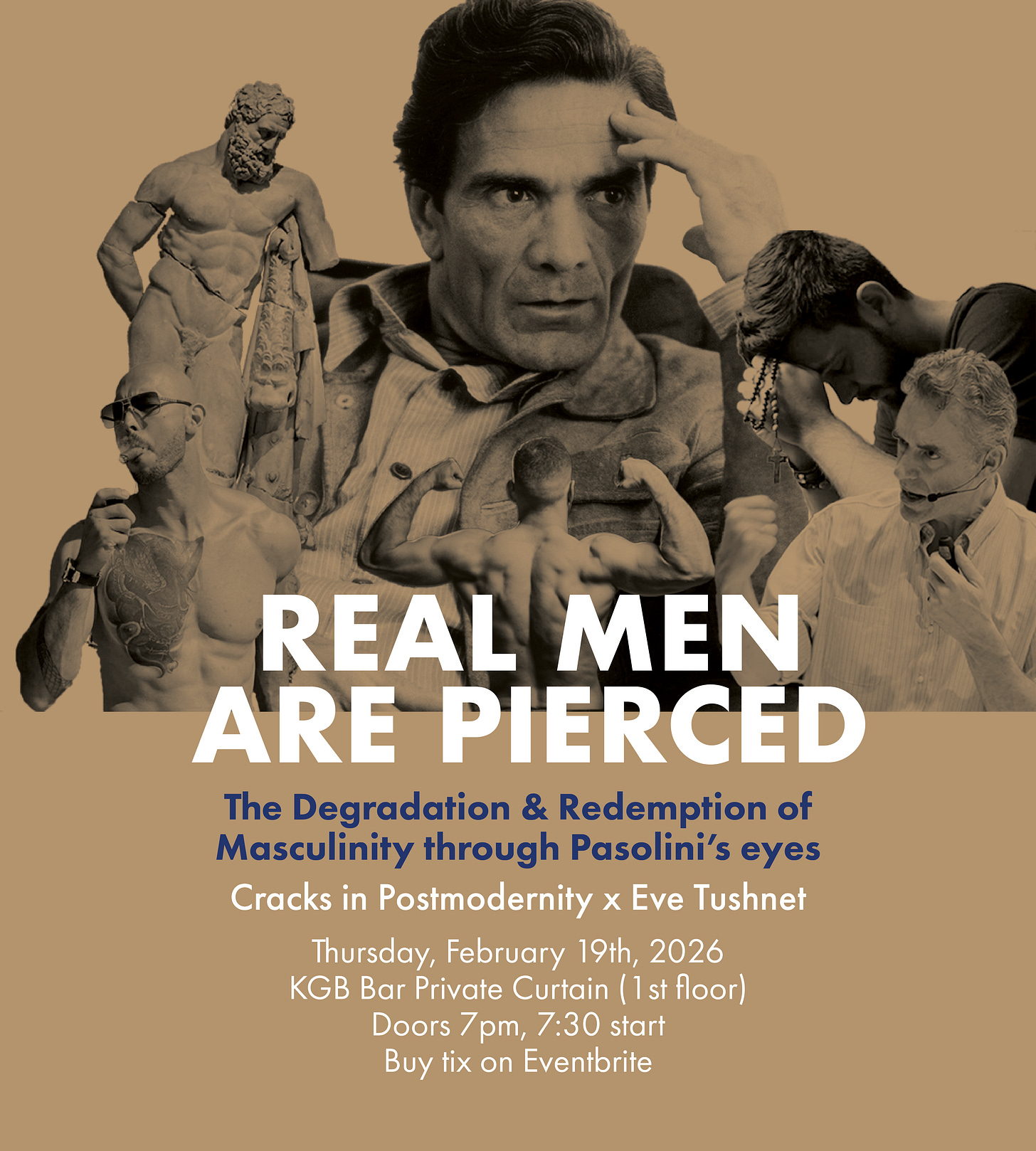 Get your tickets to Real Men are Pierced: The Degradation & Redemption of Masculinity through Pasolini’s eyes feat. the great Eve Tushnet on 2/19 at KGB. (paid subscribers, DM for the discount code)